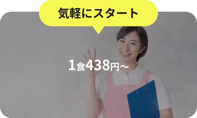 気軽に始められる!スケールメリットと独自製造ノウハウにより、1食438円の価格を実現。まずは無料サンプル試食からお問い合わせください。営業担当が詳細をご説明します。